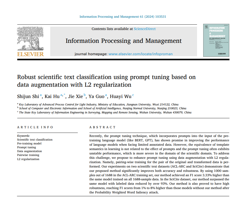 近日,江南大学物联网工程学院2020级本科生时世骏以第一作者身份在《Information Processing & Management(IP&M)》(中科院一区,IF=8.6)发表题为“Robust scientific text classification using prompt tuning based on data augmentation with L2 regularization”的学术论文,该期刊是Elsevier出版社旗下信息科学领域的权威期刊之一。物联网工程学院胡凯副教授为该文通讯作者。