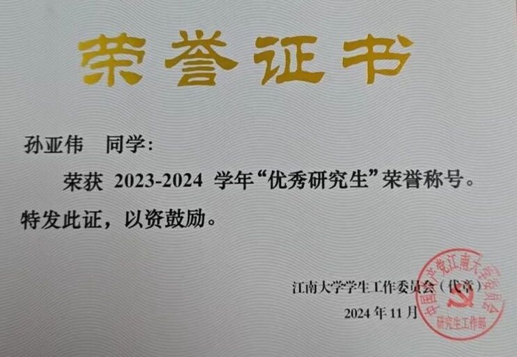 孙亚伟,汉族,中共预备党员,自动化与智能科学学院控制工程专业2023级研究生,曾任班级学习委员、院研究生会办公室部长、研究生秘书助理。以第一作者身份发表6篇中科院一区/二区Top论文,累计影响因子达50.8,谷歌学术引用达228次;主持2025年江苏省研究生科研与实践创新计划项目,申请2项发明专利;受邀代表学校参加小米科技总部行活动。曾荣获国家奖学金、小米特等奖学金、两次江南大学研究生一等学业奖学金、物联网工程学院“物联之星”、江南大学“优秀研究生”等荣誉。