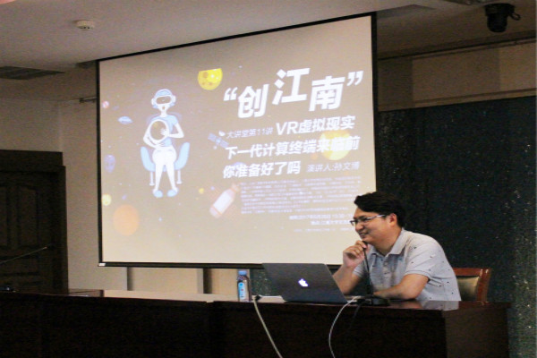 讲座中,孙文博以最打动他进入VR行业的超强VR主题公园“THE VOID”宣传片引入主题,给同学们介绍了VR的行业概况、发展历史、行业巨头以及国家政策对虚拟现实产业发展的支持等,让大家对VR有了一个初步的了解。孙文博提到,习近平总书记说的虚拟经济与实体经济结合与物联网关系密切,物联网构建实体物体和虚拟物体连接的平台,而AR和VR是其中重要的显示环节和交互平台的技术。随后,孙文博和同学们分享了他的创业故事。他谈道,兰亭数字是2015年9月创立,取名兰亭数字的原因有两个,一是兰亭数字英文名为LETINVR,他希望每个人都有机会接触到VR这种体验;二是他很喜欢王羲之《兰亭集序》中“群贤毕至,少长咸集”这句话,而在创业之时,正是需要像这句话所说的,集结一群能力突出的人聚集在一起形成团队,才能够实现合作互补,他希望兰亭数字能成为一家群贤毕至的公司。最后,孙文博跟大家展示了兰亭数字在VR营销、VR直播、VR影视和VR旅游等多个领域的成果,旨在通过具体形象的案例启发同学们发挥自己的创意。