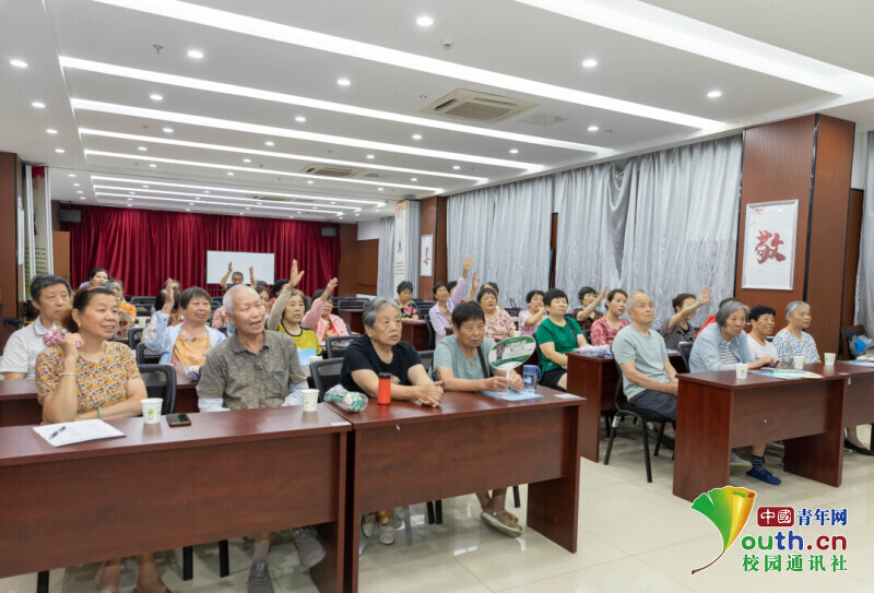 图为社区老人们积极举手回答环保知识相关问题。樊铭举 供图